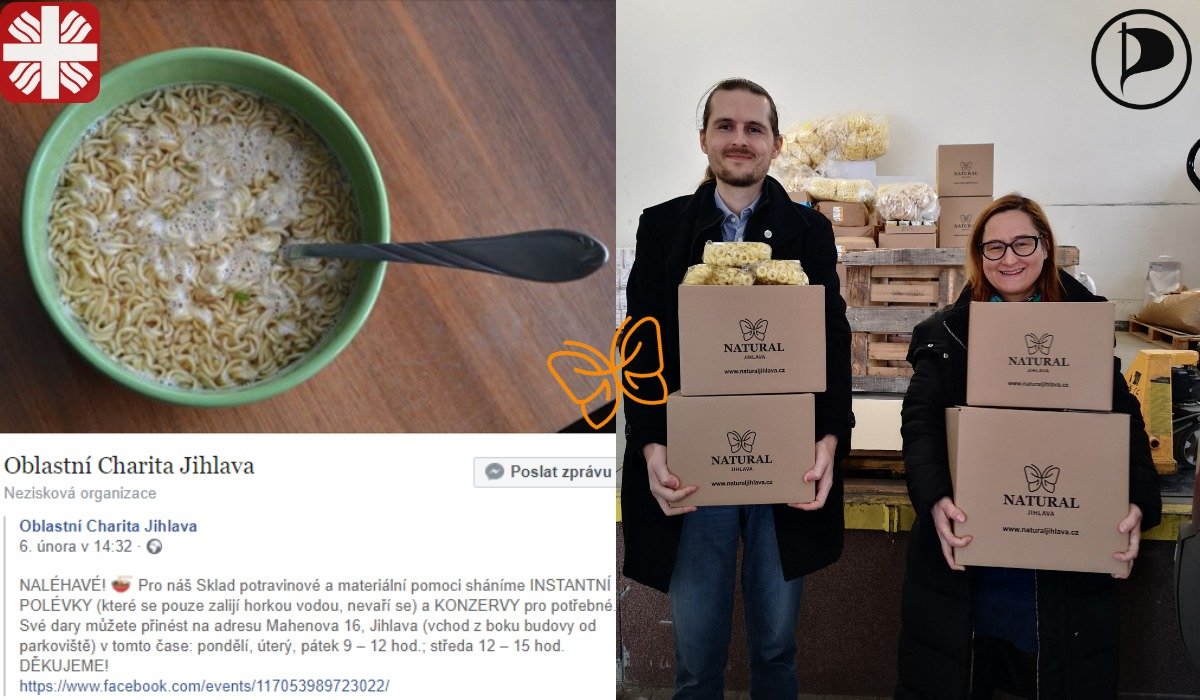 Na závěr prohlídky nakoupil Jan Pošvář 480 kusů instantních polévek, které vyrábí přímo Natural, a vyrazil do Střediska křesťanské pomoci. Zde je s Evou Novákovou přivítali s otevřenou náručí a s vděčností polévky převzali. Vedoucí střediska David Chlupáček a jeho kolega, sociální pracovník David Rydlo, jim při té příležitosti ukázali prostory a vybavenost pro potřebné, přiblížili služby, jaké poskytují a kolik klientů je využívá. Velké části z nich zahřeje tu letošní zimu žaludek instantní polévka od pirátského poslance, nebo právě od vás. Výzva je totiž stále otevřená a přispět tak můžete i vy. Své dary můžete přinést na adresu Mahenova 16, Jihlava (vchod z boku budovy od parkoviště) v tomto čase: pondělí, úterý, pátek 9–12 hod.; středa 12–15 hod. Děkujeme.